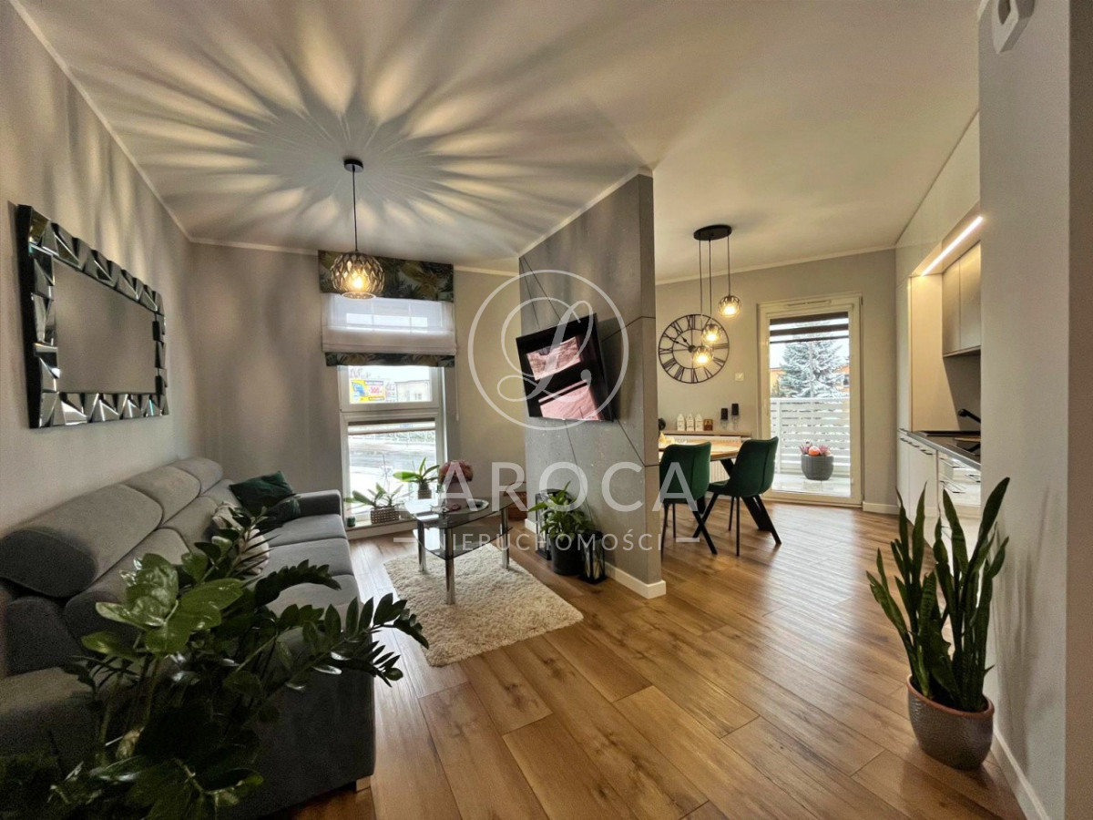 Wnętrze wykończone z dbałością o detale: ściany pokryte gładzią, w niektórych miejscach betonowe wykończenie, a na podłogach panele winylowe.