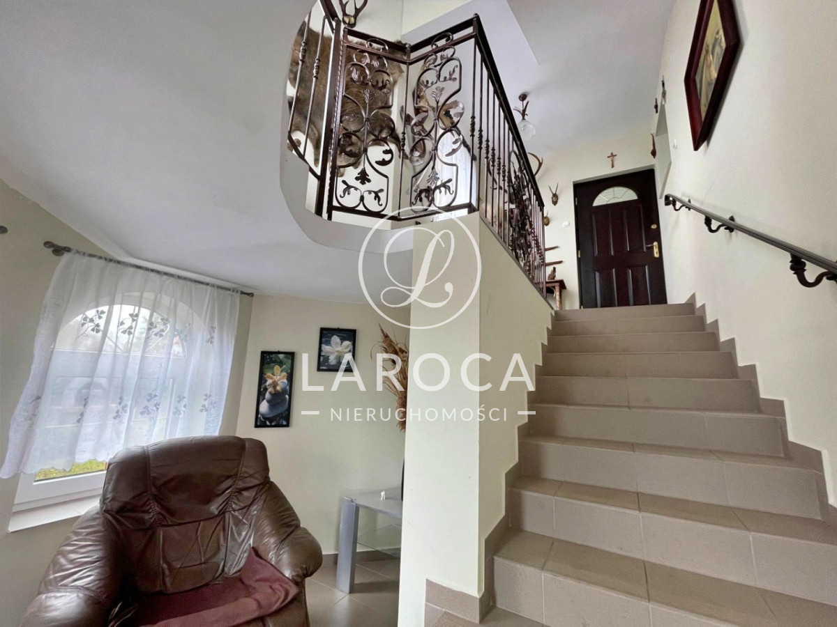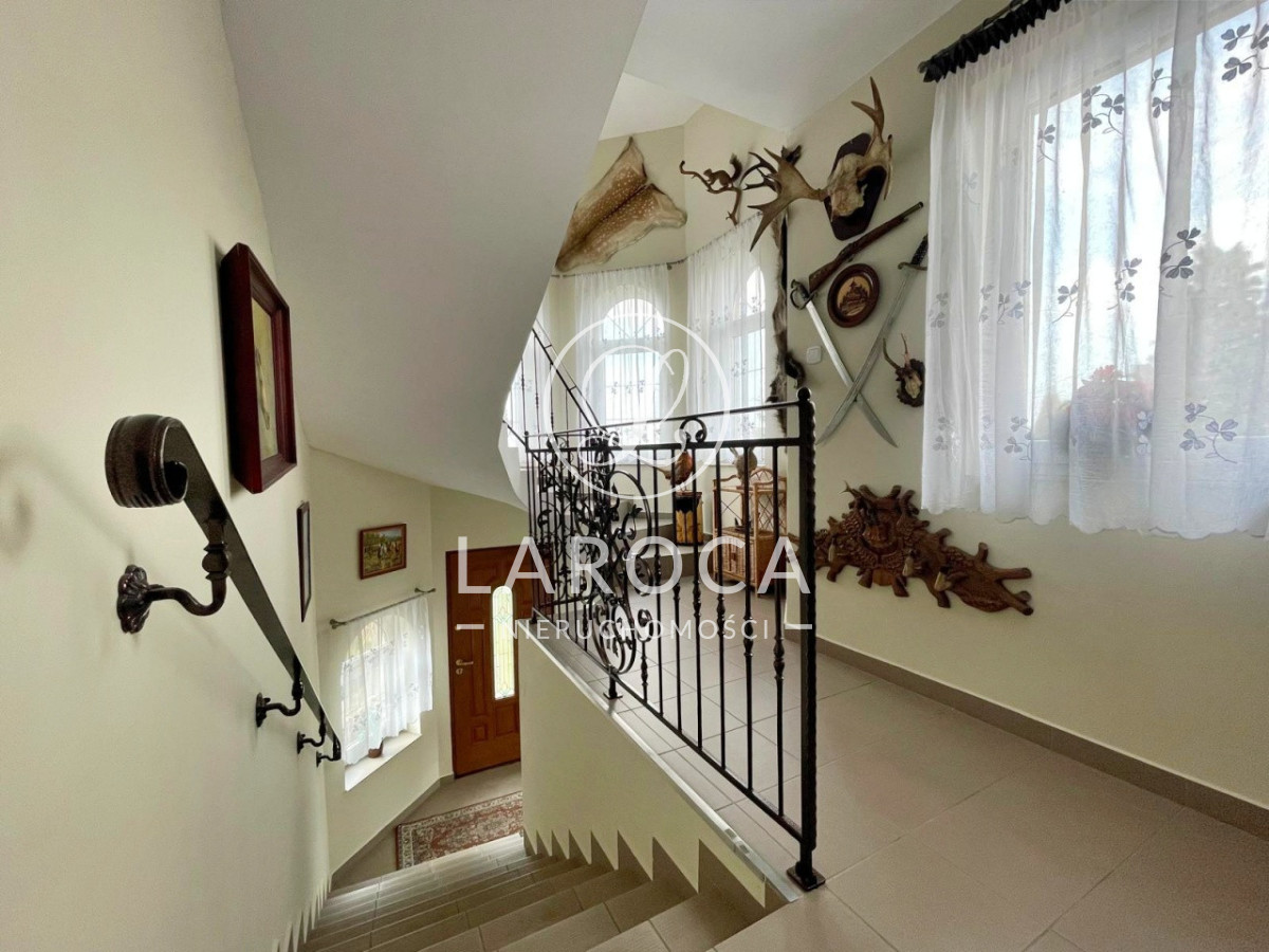 Nieruchomość wyróżnia piękny, zadbany ogród z oczkiem wodnym. Na terenie znajduje się również kamienny grill oraz altana, idealne miejsce do relaksu i spotkań rodzinnych.
